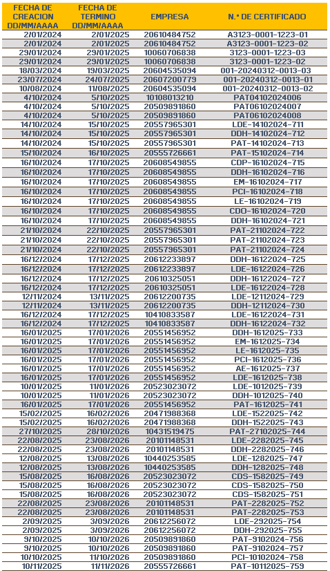 Nota: Los certificados mostrados corresponden a los emitidos desde enero de 2024 hasta la fecha actual. Si tiene alguna consulta o necesita verificar la autenticidad de los documentos, por favor comuníquese al número